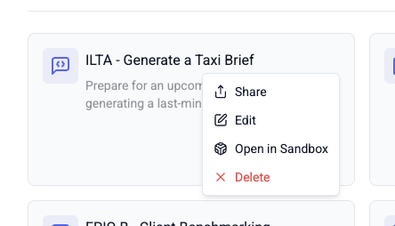 You can share prompts from the ⯠in the upper right hand corner of a prompt tile in the Prompt Library. From here you click Share and select the group(s) or individual users youâd like to share.